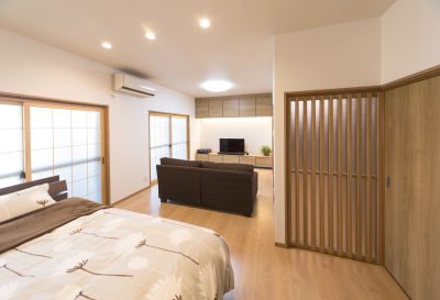 奥様の定年退職をきっかけに、「これからの時間を二人でゆっくり過ごせる空間をプレゼントしたい」との想いでリフォームを決めたK様。暮らしやすさを考えて、これまでは2階にあった寝室を1階に移動し、1階で生活のすべてが完結する間取りに変更なさいました。物置として使われている和室は間仕切りを撤去し、フローリング貼りの寝室に。壁面収納を兼ねたTVボードは、間接照明によるやわらかなあかりが落ち着きある空間を演出してくれます。セカンドリビングのような居心地と、ご夫婦がゆったりお休みになれる寝室スペースが一体となった、くつろぎの居場所が生まれました。
