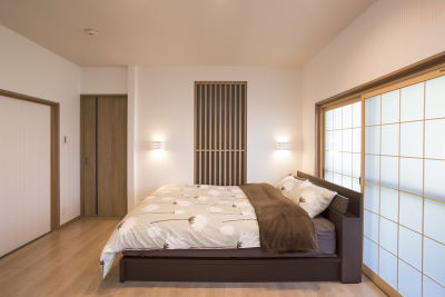 奥様の定年退職をきっかけに、「これからの時間を二人でゆっくり過ごせる空間をプレゼントしたい」との想いでリフォームを決めたK様。暮らしやすさを考えて、これまでは2階にあった寝室を1階に移動し、1階で生活のすべてが完結する間取りに変更なさいました。物置として使われている和室は間仕切りを撤去し、フローリング貼りの寝室に。壁面収納を兼ねたTVボードは、間接照明によるやわらかなあかりが落ち着きある空間を演出してくれます。セカンドリビングのような居心地と、ご夫婦がゆったりお休みになれる寝室スペースが一体となった、くつろぎの居場所が生まれました。