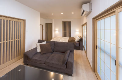 奥様の定年退職をきっかけに、「これからの時間を二人でゆっくり過ごせる空間をプレゼントしたい」との想いでリフォームを決めたK様。暮らしやすさを考えて、これまでは2階にあった寝室を1階に移動し、1階で生活のすべてが完結する間取りに変更なさいました。物置として使われている和室は間仕切りを撤去し、フローリング貼りの寝室に。壁面収納を兼ねたTVボードは、間接照明によるやわらかなあかりが落ち着きある空間を演出してくれます。セカンドリビングのような居心地と、ご夫婦がゆったりお休みになれる寝室スペースが一体となった、くつろぎの居場所が生まれました。