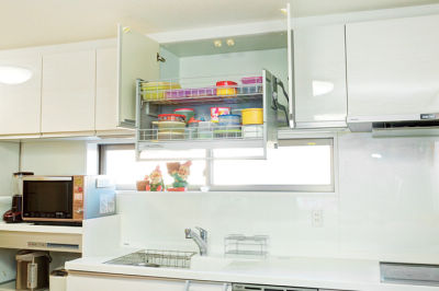 ソフトダウンウォールユニット採用の吊戸棚ならラクに取り出せます。