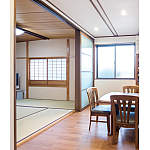 和室の天井とフローリング、 サッシや柱の色、キッチンの扉柄や窓枠などの色を合わせて空間に統一感を。和室側は襖の柄や畳の縁を洋室に合わせてコーディネイト。