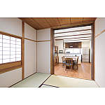 和室の天井とフローリング、 サッシや柱の色、キッチンの扉柄や窓枠などの色を合わせて空間に統一感を。和室側は襖の柄や畳の縁を洋室に合わせてコーディネイト。