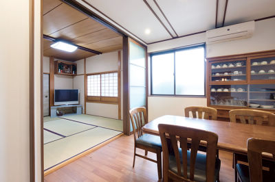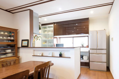 親戚が集まる機会の多いN様は、もてなすための広く使える空間を要望。既存の和室をいかして、ダイニングとの間に間仕切開閉壁を設置し、開けば広いLDKとしても使えるように変更しました。「親戚などが集まった際には、キッチンにいても話が弾むようになりました。対面キッチンなので配膳もしやすく、とても便利です」とN様も大満足。ダイニング側に付けたニッチ棚もポイントとなり、飾り棚として活躍しています。