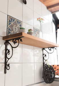 調理スペース前は、無垢板×アイアンの飾り棚で機能とおしゃれ感を演出。清潔感ある白タイルにアンティークなアクセントを効かせて落ち着きを。