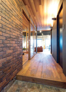 ワンコたちは、以前の住まいでは、フローリングが滑って膝に負担がかかっている様子だったので、床にボルドーパインの無垢材を採用し、さらに爪の引っかかりがよいようにブラッシング仕上げにしました。