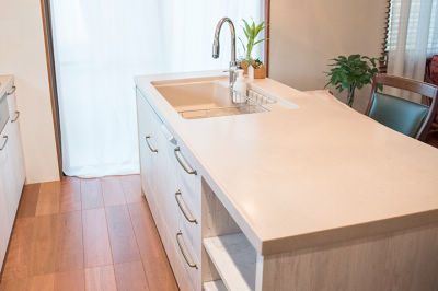 家事動線に便利なⅡ型アイランドのキッチンはシンク横のスペースが広く、2人で並んでもゆったり。収納を増やしたいという要望にも応え、フロアユニットへすべての食器が収まるように計画し、お掃除もラクなオープン棚を設けました。