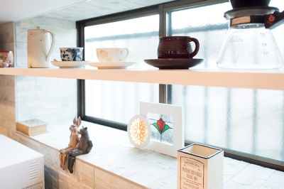 飾り棚は手前に、宙に浮いたように設置し、自然光が小物を照らす演出も計算。