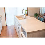 収納・回遊動線を考慮してレイアウトしたⅡ型アイランドのキッチン。シンク横にご主人が珈琲を淹れる広いスペースを。