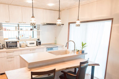「家事をしながらお庭が見えたらいいな。お庭の見える位置にしてね」と、手入れされた庭を一望できるこの場所に対面キッチンをリクエスト。