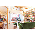 勾配天井の天窓から降り注ぐ自然光、テラスからの眺めは、山々の稜線とそこに沈む夕日。開放的で心地よく、自然を楽しめるリビング。