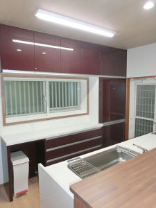 勝手口のドアや窓に干渉しないよう特注し、壁面にぴったりと収まりました。足元にはゴミ箱を置くスペースも設けました。