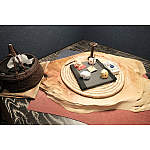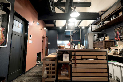 壁には古材を貼り、部屋の雰囲気に合うよう食器置きは水屋箪笥をリメイクして使用