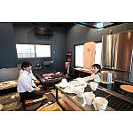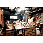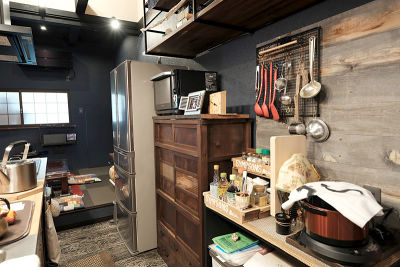 壁には古材を貼り、部屋の雰囲気に合うよう食器置きは水屋箪笥をリメイクして使用