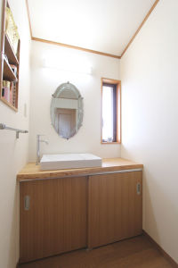 1.こだわりの無垢カウンター 2.愛着のある鏡はそのままに 3.収納スペースを確保