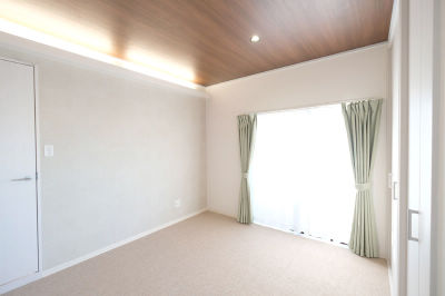 他の部屋と比べトーンダウンして落ち着いた雰囲気に 天井を木目調と間接照明がリラックス空間をうみます
