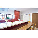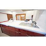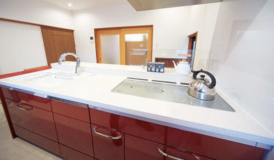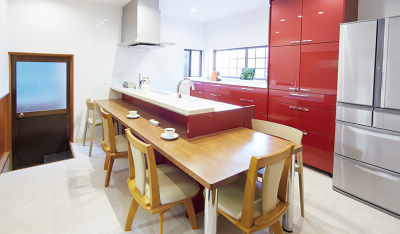 Lクラスの対面キッチンにオリジナルのカウンターテーブルを取り付け、夫婦ふたりでも4世代が集っても、会話が弾むスペースに生まれ変わりました。
