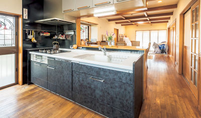 築18年ヒノキ造りの和風建築の趣に合う素材を使い、水廻りをリニューアルしました。キッチンに造作したステンレスカウンターは、便利な調味料置き場に。トイレのセンサー水栓や明るいバスルームは、遊びに来るお孫さんたちに好評です。