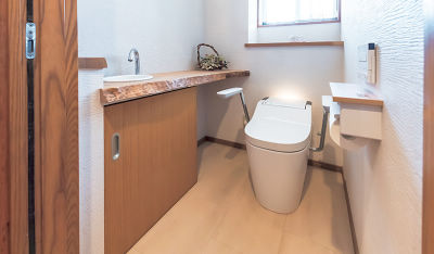 自動掃除機能でお手入れが楽になったトイレ。将来に備えてアームレストを設置。