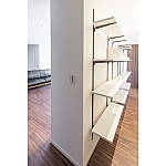 テレビボード裏の棚は可動式なので調節可能。回遊できて使い勝手がよく、DVD等の収納に便利。