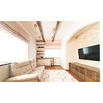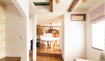 奥様の願いは「アンティークモダンなLDK」。アーチ型の垂れ壁でやわらかな雰囲気を演出しています。和室を洋室に改装し、仕切りもなくしてキッチンからリビングまで見渡せる空間に。お子様が2階のプレイルームにいても、光床を通じて音と気配が1階に伝わります。