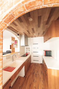 キッチンの寸法はセンチメートル単位で指定。天井の壁紙からアーチ型の垂れ壁までこだわりました。