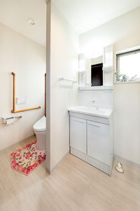 洗面とトイレの間にあった壁を半分撤去して空間をひとつし、動線を短く。