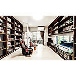 壁一面の棚には車にまつわるアイテムをディスプレイ。ギャラリーと壁の中心にFIX窓を設置。ドライビングシートからはいつでも愛車を鑑賞できます。