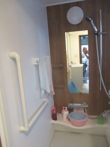 床はFRP製になり滑りにくく、出入り口から洗い場にかけてはL型の手すりを設置しました。体が安定し、安心して入浴していただけます。
