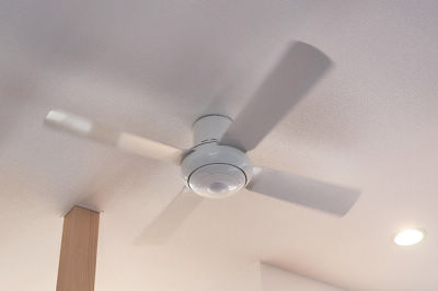 階段ホールに、シーリングファン。心地よい空気の流れをつくり、暖房費節約も期待できます。