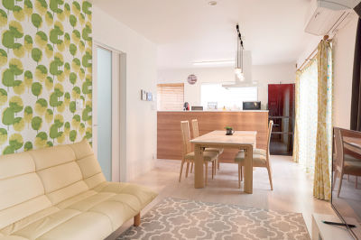 使われていなかった和室とひと続きにした、L字空間の中央にアイランドキッチンを配置するプランをご提案。和室があった場所は、N様のご要望でネイビー色の格子デザインのドアに、レンガ調のクロスをあしらい、カフェ風の空間に。キッチンを挟んで反対側には、リビングダイニング、家事室が続きます。この広いLDKには入口が3つあり、機能的な動線を実現。さらにどこから出入りしてもLDK全体の照明操作ができ、ムダな動きのないようにスイッチを配置しました。