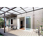 庭で過ごす時間も楽しみたいと親設したデッキ。窓を開けると、リビングとひと続き。