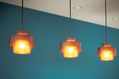 ペンダントを流し元灯に。ブルーの壁紙と相まって美しく映えます。