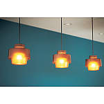 キッチンとリビングがつながった開放感。ブルーの壁紙、黄色のペンダント、そして庭へ抜けていく視線。この眺めが本当にお気に入りです。リフォームして良かったなと思えます。明るく開放感のあるキッチンになって娘たちも本当に驚いていました。