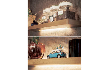 飾り棚の照明。奥様が集めたコレクションをライトアップします。