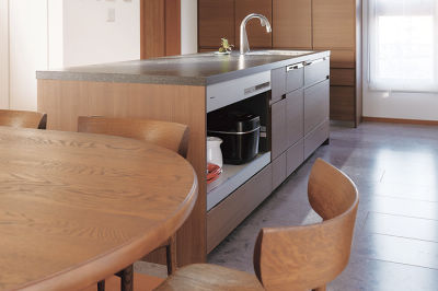 キッチンは娘さんと一緒でも使いやすいアイランド型に。ガスコンロを壁側に配置したことで、レンジフードも壁付けでき、キッチンの上がすっきり。隣に家事室を設けて、奥様の作業スペースをまとめました。大きなモノの収納場所としても活躍しています。