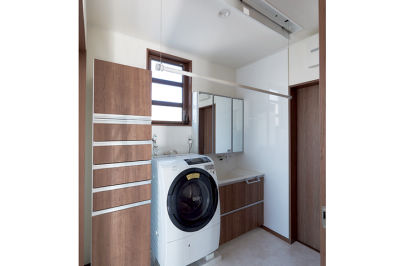 キッチンは娘さんと一緒でも使いやすいアイランド型に。ガスコンロを壁側に配置したことで、レンジフードも壁付けでき、キッチンの上がすっきり。隣に家事室を設けて、奥様の作業スペースをまとめました。大きなモノの収納場所としても活躍しています。