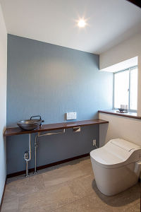 上品な陶器の手洗いにブラックの水栓をしつらえ、洗練されたトイレ空間。今後車いすでも使用できるように、トイレ前には車いすの回転に十分なスペースを設け、開口幅も確保。手摺を取付できるように壁には補強材を入れています。