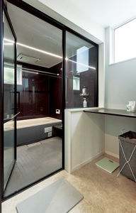 吹き抜けの陽光が降りそそぐ土間と収納をすべて引き戸に収めた遮るものがないキッチンでLDKは広々と開放的とお喜びです。人の回遊性にもこだわり、キッチン奥から洗面室・脱衣室・浴室・ランドリーへと一本の動線でつながるように配置。ぐるりと回ってリビングに抜けられ、ご夫婦の暮らしがラクになったと太鼓判をいただきました。