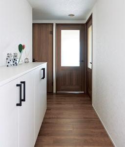 玄関収納はロータイプを選定。居室のドアを採光タイプにして、明るさを確保しました。