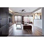 リビングは、おふたりがお好きなハワイのリゾートホテルをイメージ。グレー系の床材やウッド調のブラインドなど落ち着いたトーンでまとめ、穏やかな時間が流れる空間をつくりました。さらに2匹の愛猫が自由に遊べるようキャットウォークを設置。取り除けない梁を美しいアイテムに仕上げました。