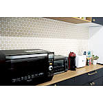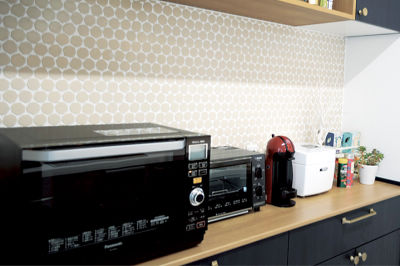 カタログを見てひと目で気に入ったネイビーブルーのカップボード。ベージュ色の変形タイルを合わせて、より個性的でお気に入りのキッチンに。