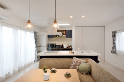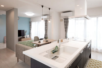 可愛いカジュアルスタイルのインテリアがお好みで、一目惚れされたシステムキッチンを中心にコーディネイトも考えました。ゆったり使えるキッチンはLDK全体を見渡すことができ、居心地のよい住空間となりました。