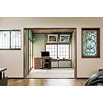 和室仕上げの壁はうぐいす色に仕上げ落ち着いた空間に。新築時から大切にされているステンドグラスが引き立ちます。