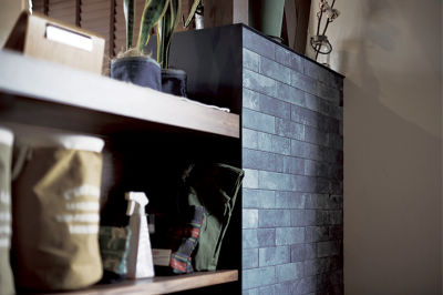 一目惚れしたブルーのタイルを、筋交いの下半分に使用し、お洒落なデザインに。
