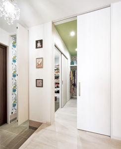 構造上必要な筋交いは残しながらも、塗装を施しインテリアのアクセントとなるよう空間全体を演出。「広々した空間」と「耐震性」という相反するご要望をバランスよく実現しました。