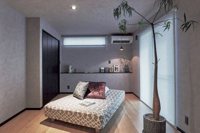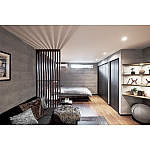 キッチンは自らカフェの厨房に立つH様が使い慣れた厨房機器を選択。メタルな質感が映えるアイランドスタイルに。開放感を高めるためLDKに隣接する寝室の壁は、縦格子の建具でゆるやかに仕切りました。照明はすべて集光タイプで、陰影のある空間を演出。コンクリート調の壁は、年を重ねても違和感のない色調のものを選び、落ち着いた印象に仕上げました。