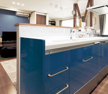 ネイビーのキッチンはリビングのブルー壁とマッチ!使いやすくて大好評。