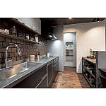 独特の鈍い光沢が楽しめるキッチンのステンレスカウンターがお気に入り。夫は軽く触れるだけでスマートに操作できるスイッチが気に入っています。両方とも全体のヴィンテージスタイルによく馴染んでいます。