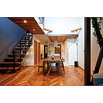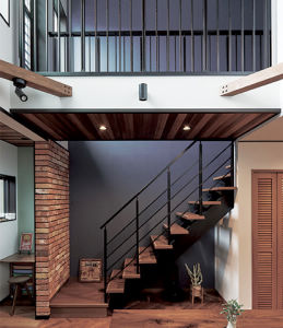 アイアンの階段とレンガ壁で個性が光る、異素材を組み合わせたインテリア。