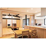 木をふんだんに使ったぬくもりあるLDK。床は足ざわりのよいヒノキを採用。料理をする奥様と、リビングの家族との目線を近づけるためキッチンの床を一段低く設計。